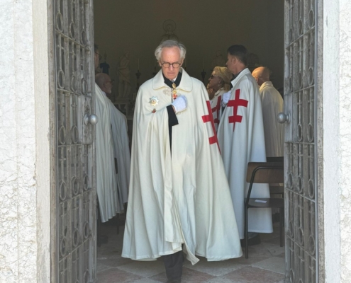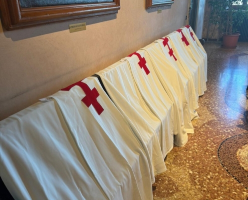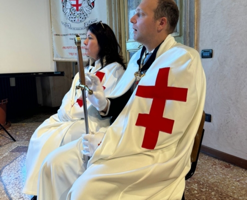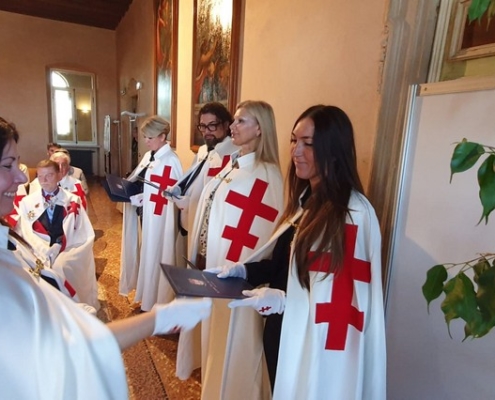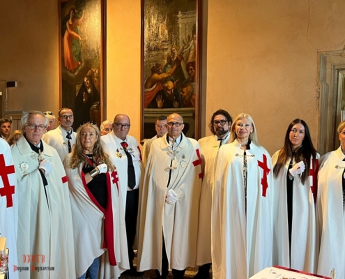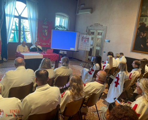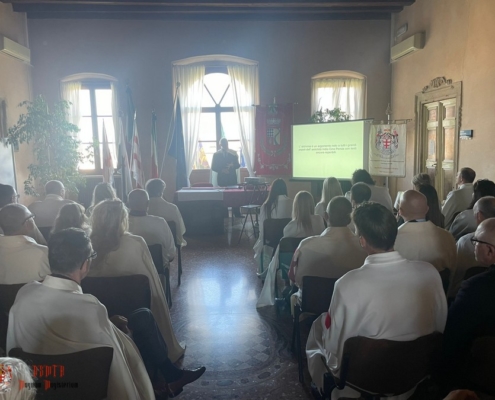 Successivamente, i convenuti si sono trasferiti nella magnifica Sala Quadri del Municipio per la seconda parte dell’incontro. Il Priore ha aperto i lavori offrendo brevi ma profonde riflessioni sul senso di appartenenza all’Ordine e, successivamente, in un momento di grande tensione emotiva, sono stati consegnati i brevetti a cinque nuovi Cavalieri investiti a Pagnano d’Asolo lo scorso maggio. Sono stati inoltre accolti due nuovi postulanti, Catia e Tiziano, sottolineando l’importanza del loro ingresso nell’Ordine.